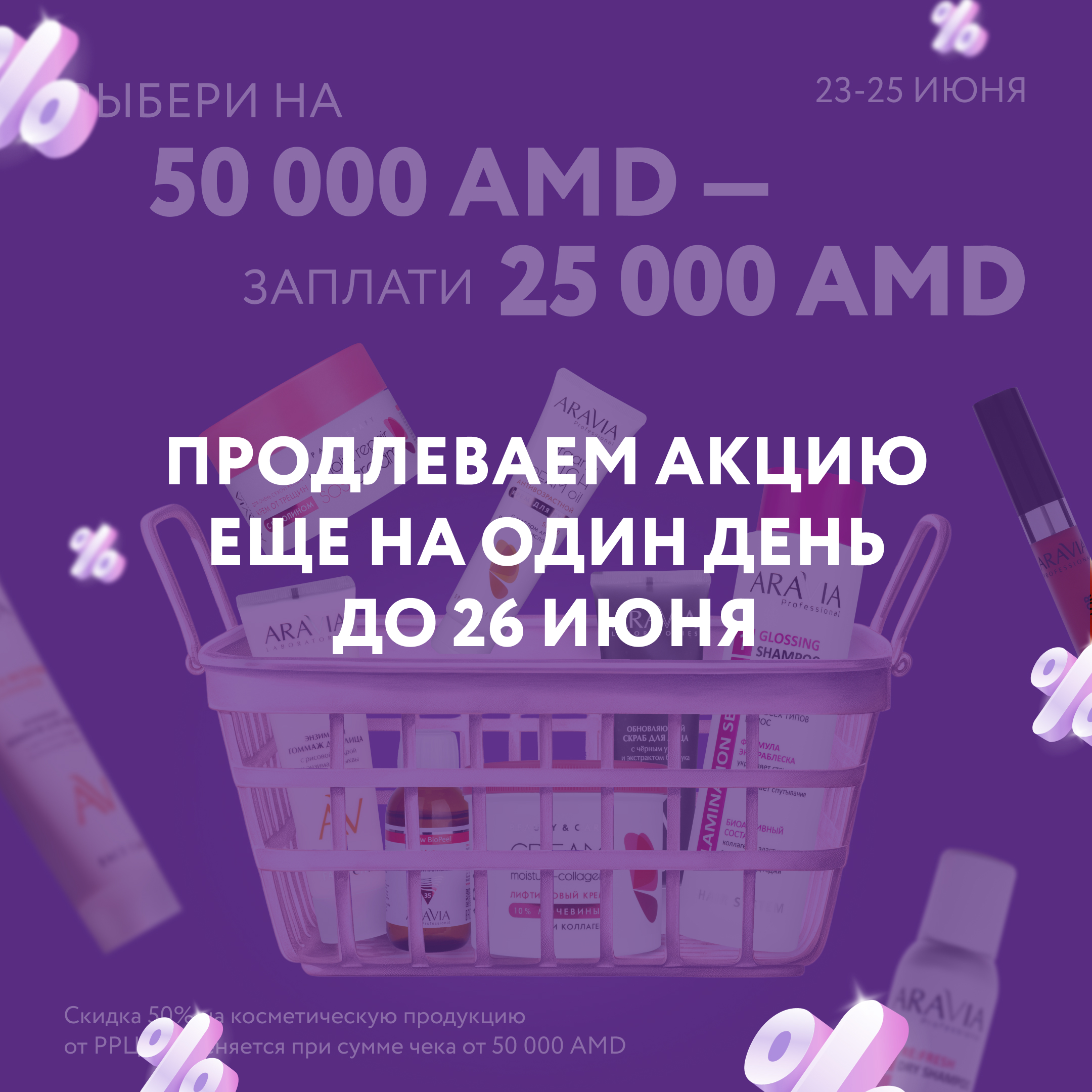 23, 24 и 25 июня 2025 действует скидка 50% от РРЦ на всю косметическую продукцию при единовременной покупке на сумму от 50 000 AMD.